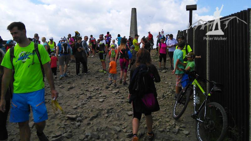 Po doplnění birelových vitamínů vyrážím po žluté na Lysou horu. Dalších 800 výškových metrů na 6 kilometrech. To už nešlo vůbec hladce. U vysílače jsem se zpožděním hodinu a 40 minut. A unavený jako pes. Všude milion lidí, na všechno fronty. Tak posvačím z vlastních zásob a natáhnu se na vyhřátý trávník. A co se nestalo. Vzbudil jsem se po 50 minutách. Dívám se do itineráře, ale tohle tam určitě nemám.