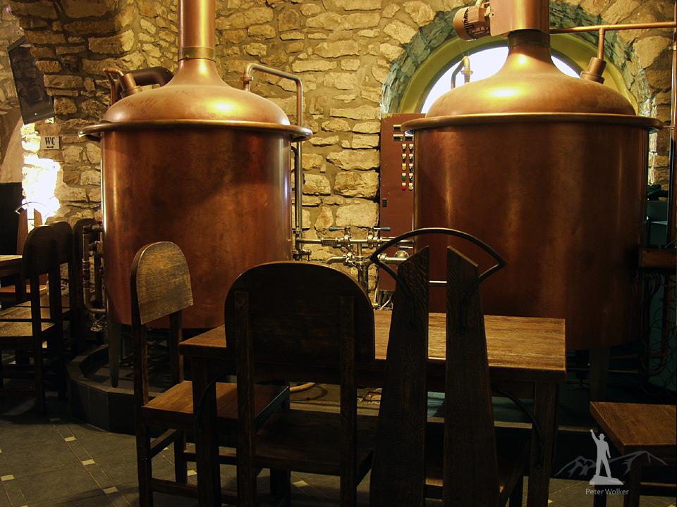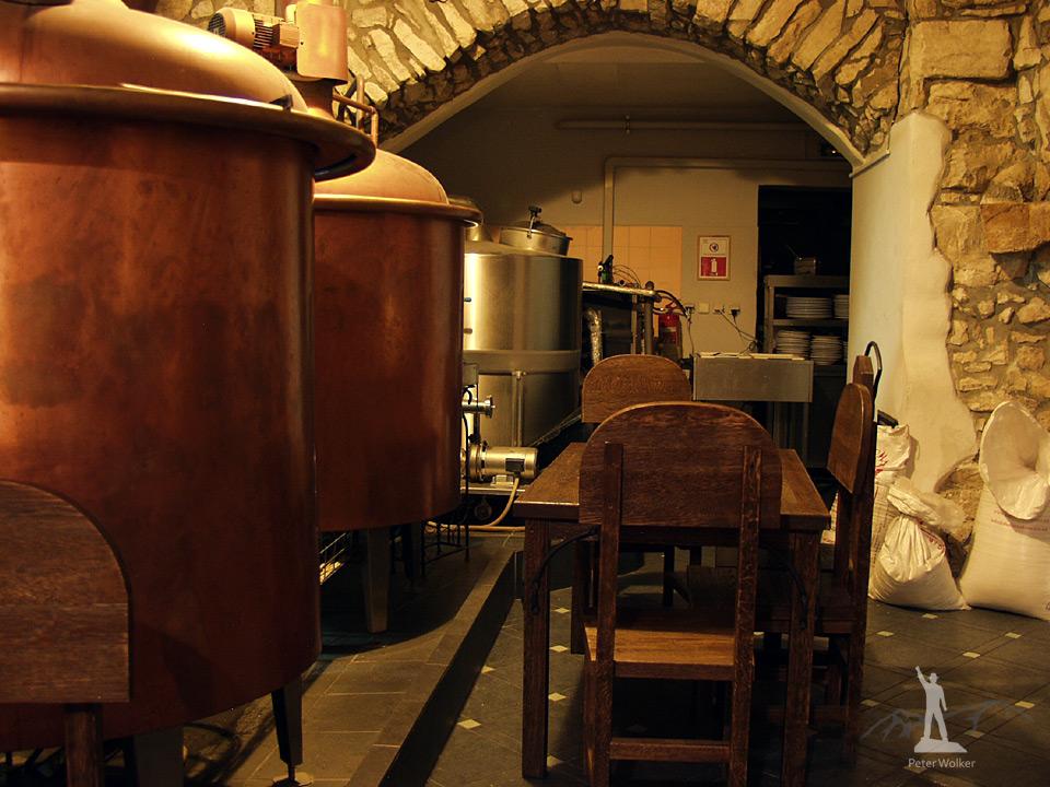 Pak jsem zašel za číšníkem s otázkou, kde mají varnu a jestli ji můžu vidět. Řekl, že všechno kuchtí ve sklepě. Sice to teď mají zavřené, ale že mě tam vezme. V tu chvíli jsem se na něho pozorně zadíval, jestli nepostřehnu nějaký náznak "vedlejšího úmyslu". Naštěstí nic, takže jsem se šel do sklepa mrknout na tanky beze strachu. Naprosto dokonalá sklepní pivnice jak má být. Radost posedět pro téměř 30 lidí.