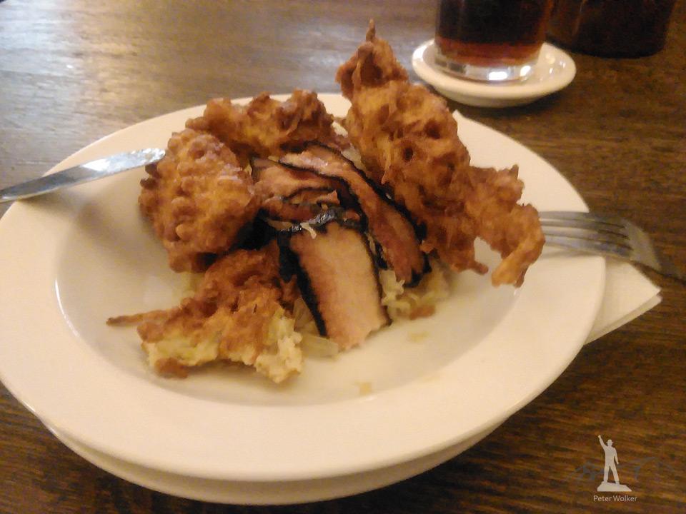 S nadšením se dávám do studia jídelního lístku. A narážím na něco, co jsem ještě nikdy neměl. Bramboráčky se slaninou a se zelím za 109,-. Hned si to objednávám a za dvanáct minut mám plný talíř před sebou na stole. Spíš než placky to jsou nugetky, nebo jak bych to nazval. Křupavé, chuťově velmi dobré, k tomu ta slanina a kyselé zelí. No naprostá dobrota. Krásně jsem si nacpal bachor a zalil to dalším pivkem. Cítil jsem se absolutně spokojeně, asi jako šprt ve vědecké knihovně.