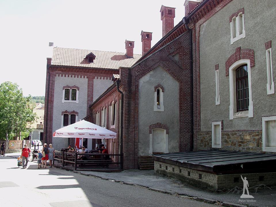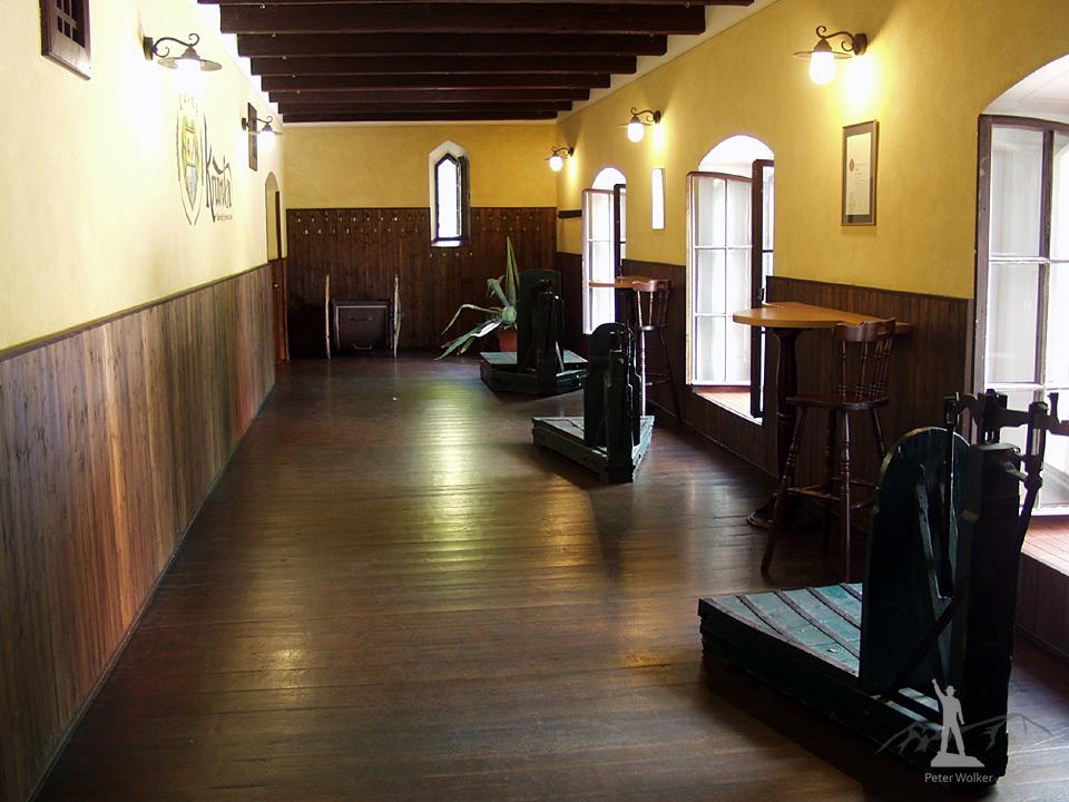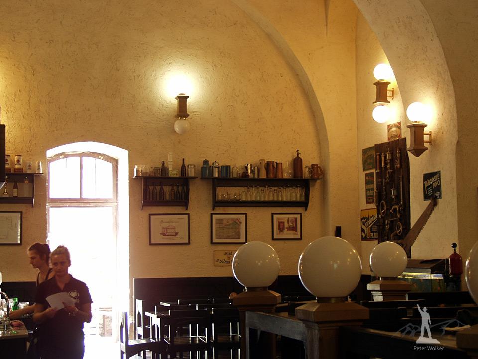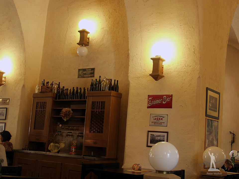 Napitý a napapaný se stěhuju dovnitř. Jsem zvědavý, jak to vypadá v pivnici, kterou postavili prý už hodně, ale hodně dávno. Vysoké, šestimetrové klenuté stropy, na stěnách hromady pivovarských rekvizit. Některé části jsou výš, některé níž, takže hospoda je opticky rozdělená. Jsou tu normální i vysoké stoly a mezitím sloupy podepírající klenbu. Líbí se mi tu. Takhle si představuju pivnici starého pivovaru.