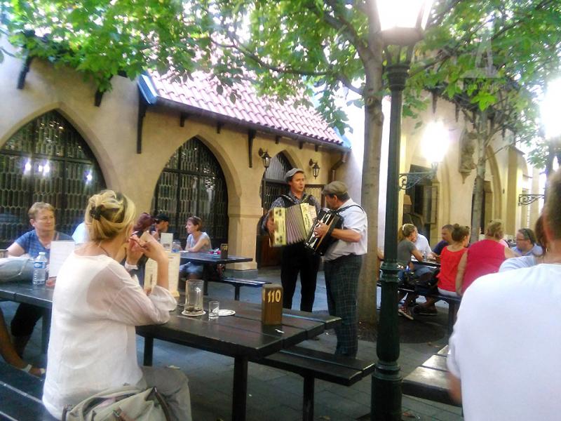 Z ulice tento stylový pivovárek vypadá naprosto klidně a usedle. Ale atmosféra uvnitř je parádní, hraje tady harmonikář a lidi zpívají a ťukají kryglíkama jako za starých časů. Usadil jsem se hned k výčepu, abych nečekal na pivíčko. A pak mě lehce zaskočila pomalejší reakce číšníků, čekal jsem celé čtyři minuty o suchu. Konečně dostávám to jejich vyhlášené pivo - Flekovský ležák v 0,4 za 59 korun a leju si ho do krku. Jako bych pil studené kafe...