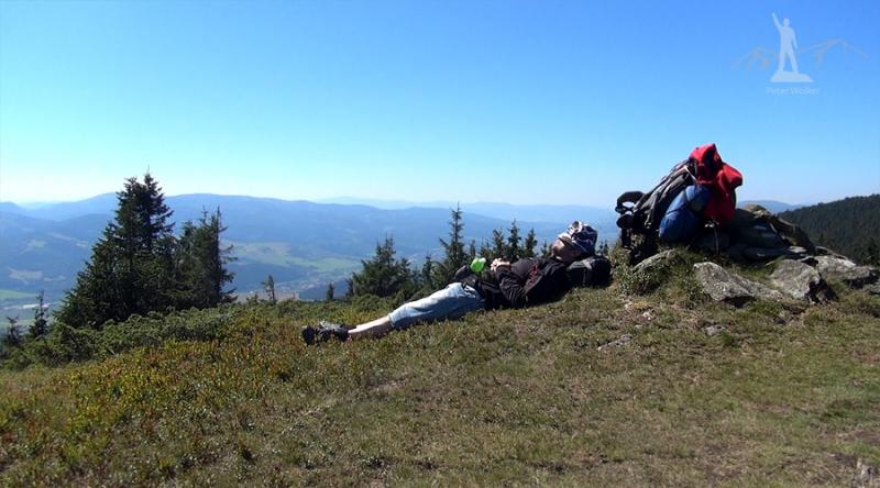 Mám v plánu ujít alespoň 25 kilometrů. Na hřebenu potkávám celkem dost lidí. Mezi nimi běžícího borce s malinkým batůžkem, turistku s malou dcerou anebo statného tatíka, kterému připadalo strašně veselé, že já jsem z Rožnova a on z Rožňavy. Přestože jsem šel po hřebenu bez nějakého velkého převýšení, ten dvacetikilový bágl mě pomalu ničil. V poledne po vydatném obědě, moučníku a borovičce, jsem to na chvíli zapíchnul. Na 40 minut. A spálil jsem si lýtka až do filalova. Jako malý kluk.