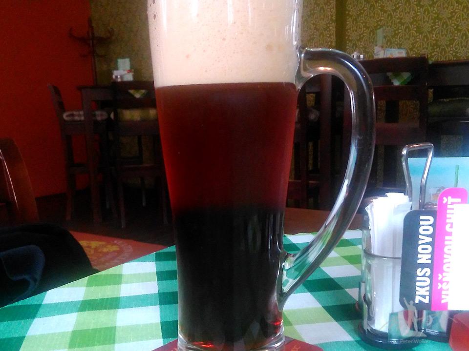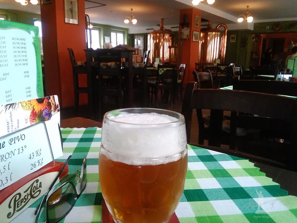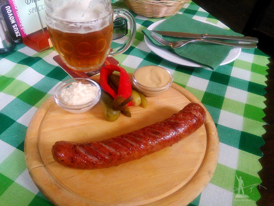 A pak jsem se vydal do Svatováclavského pivovaru, kde jsme byli někdy před třemi lety. A měli taky výborné pivo. Začal jsem světlou Svatováclavskou 12°, pak jsem koštnul tmavé pivo pana Bruna. To ale nebylo nic pro mě. Tak jsem šel do řezaného piva pana Jošta. Sice efektně natočené, ale ztracený záměr smíchání chutí řezaného piva. A pak nastal čas dát si nějakou mňamku. Z nabídky nejlépe vyšla grilovaná Sládkova klobása, kterou jsem si prostě musel objednat. Za dvanáct minut přede mě servírka Jitka položila nádherný kousek s křenem a hořčicí. Tu fotku si vytisknu a dám si ji na poličku před fotky dětí.