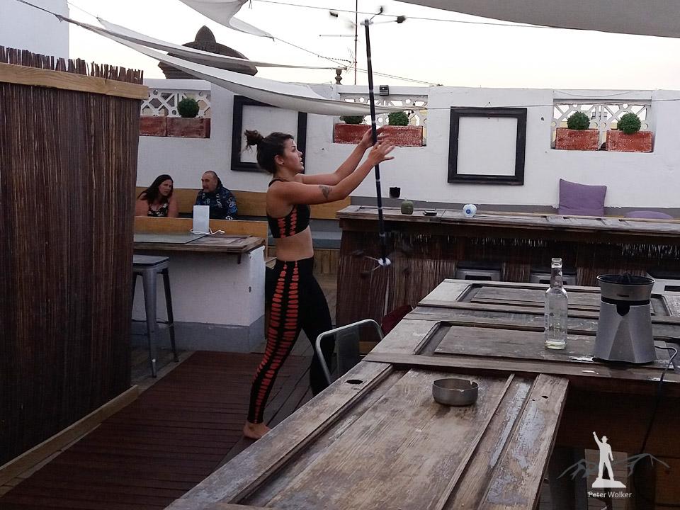 Bar na terase otvírá v 7 večer. Kořku tady lejou do třídecových zavařovaček. Velmi originální. Jako obsluha se tu střídá Richie z Londýna a Patricia z Polska. Ta si vydělala ve firmě v Holandsku a teď cestuje po hostelech a zároveň si tam i přivydělává. Z Las Palmas má namířeno do hostelu v Izraeli. A vůbec se nebojí tequily.