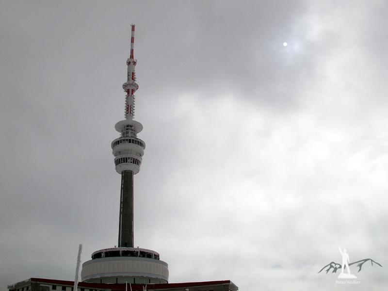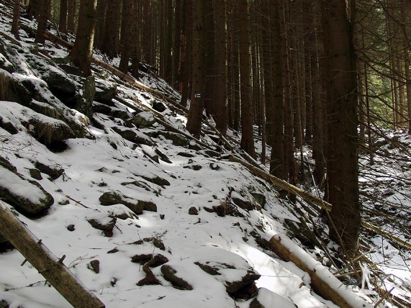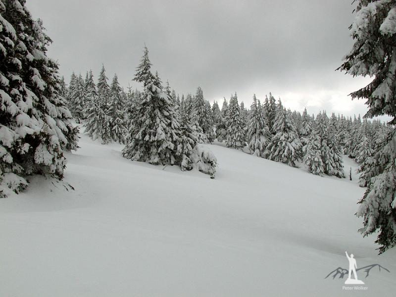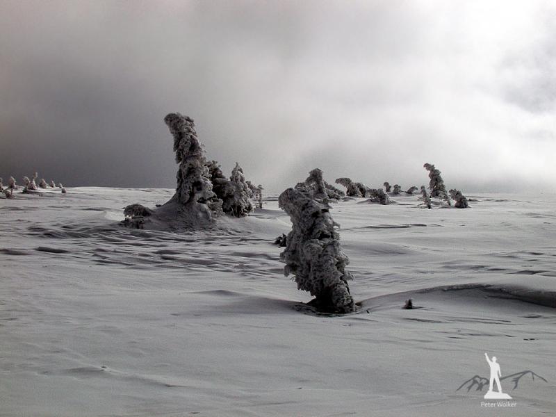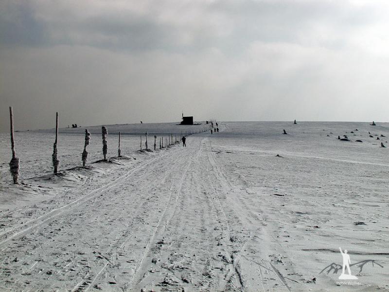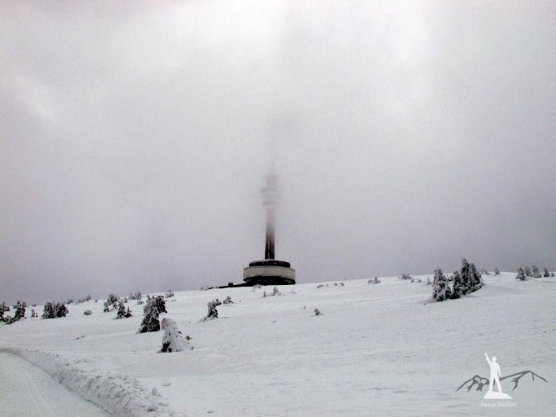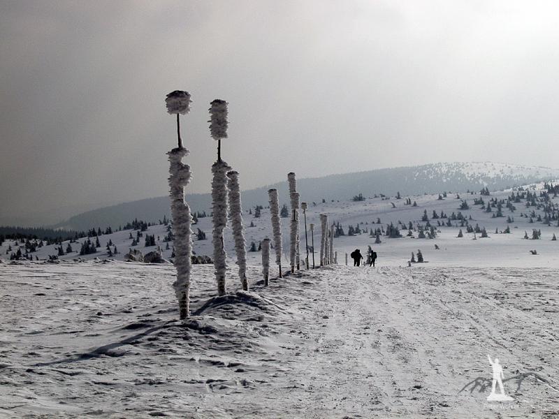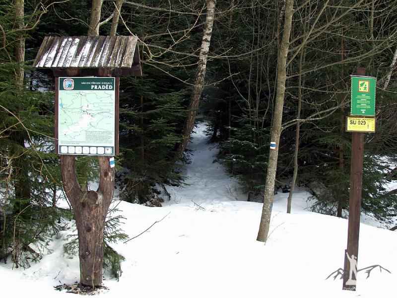 Samozřejmě to nevzdávám, oblíkám se a v 8:30 vyrážím. Půlka cesty pohodově po asfaltce. Pak vcházím do lesa a začíná peklíčko. Pokud chcete zažít adrenalin na krátké trati, vyrazte v zimě na Praděd po modré trase ze západní strany. Tohle nezapomenete. Krpál jak prase (= prudký, těžce schůdný svah). Cestou si 176 krát řeknete: "Už nikdy! Už nikdy!" Žádné prošlapané stezky jako v Beskydech. Pár starých stop, do kterých se boříte až nad kolena. Naštěstí ve chvíli, kdy dopíjím poslední vodu, zahlídnu siluetu vysílače. Jsem zachráněn. Nahoře lidí jak metele, hospoda narvaná. Vedou tady totiž i normální cesty. V bufetu kupuji Tatranky a vody, a dobíjím energii. Pár fotek a vyrážím nazpět jinou, zdánlivě příjemnější trasou. Jenže bych to nebyl já, abych nepřehlídnul odbočku. Celkem 5 kilometrů navíc... Jsem borec.